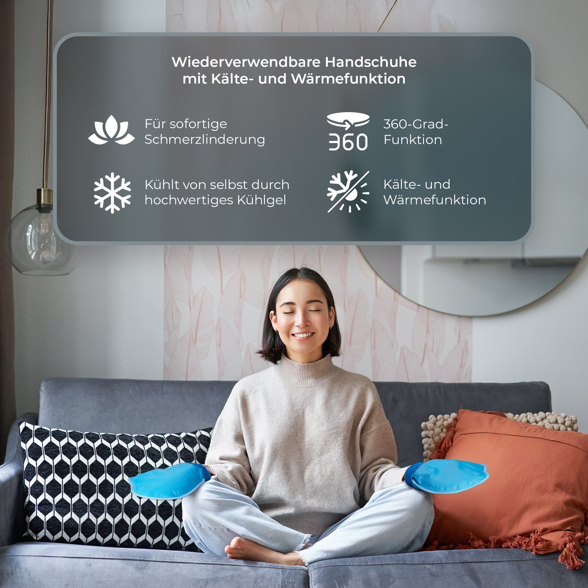 Durch Erwärmen in der Mikrowelle entsteht eine angenehme Wärmeanwendung, die das Wohlbefinden im Bereich der Hände unterstützen kann. Die grossflächige Gelzone ermöglicht eine rundum wirkende 360°-Temperaturfunktion.