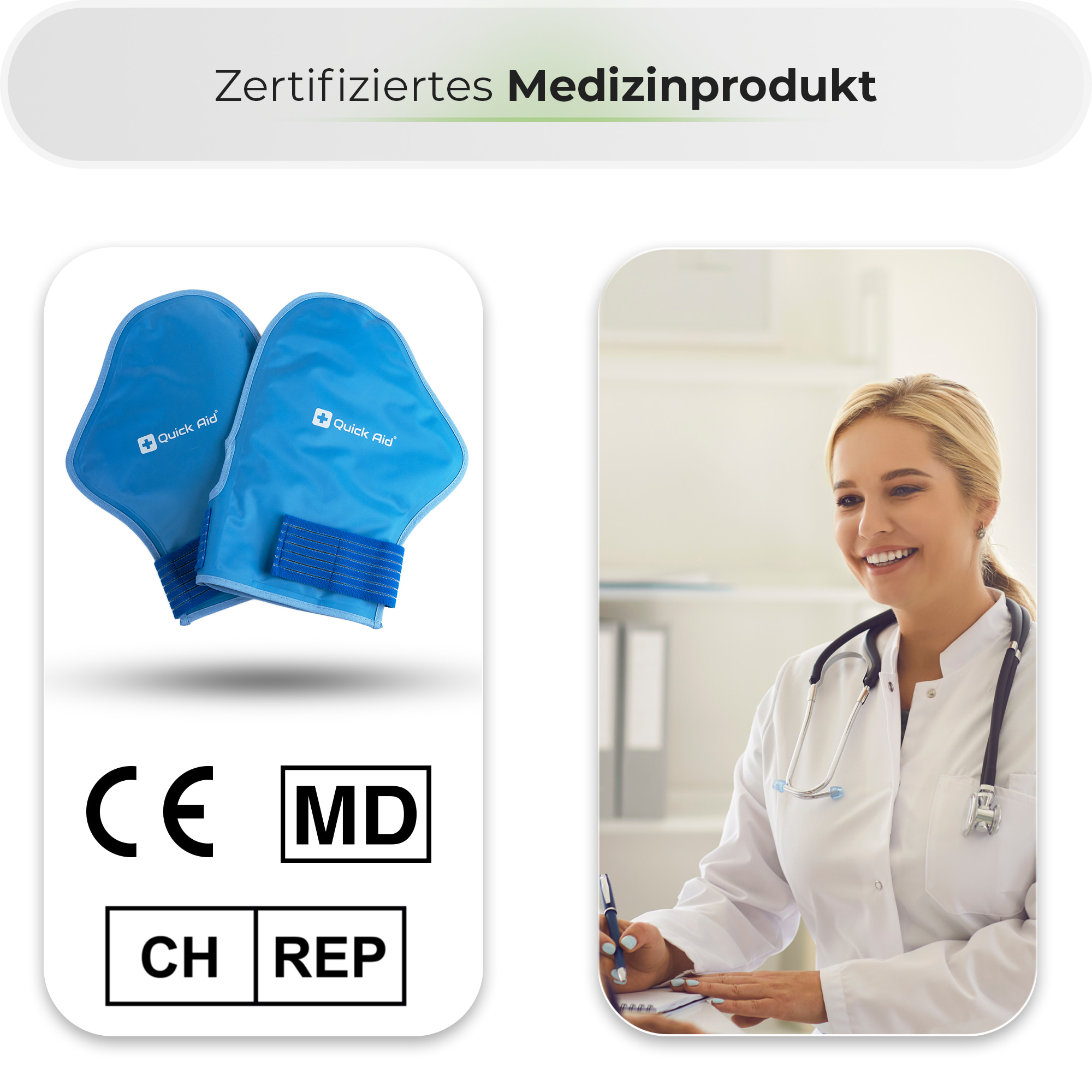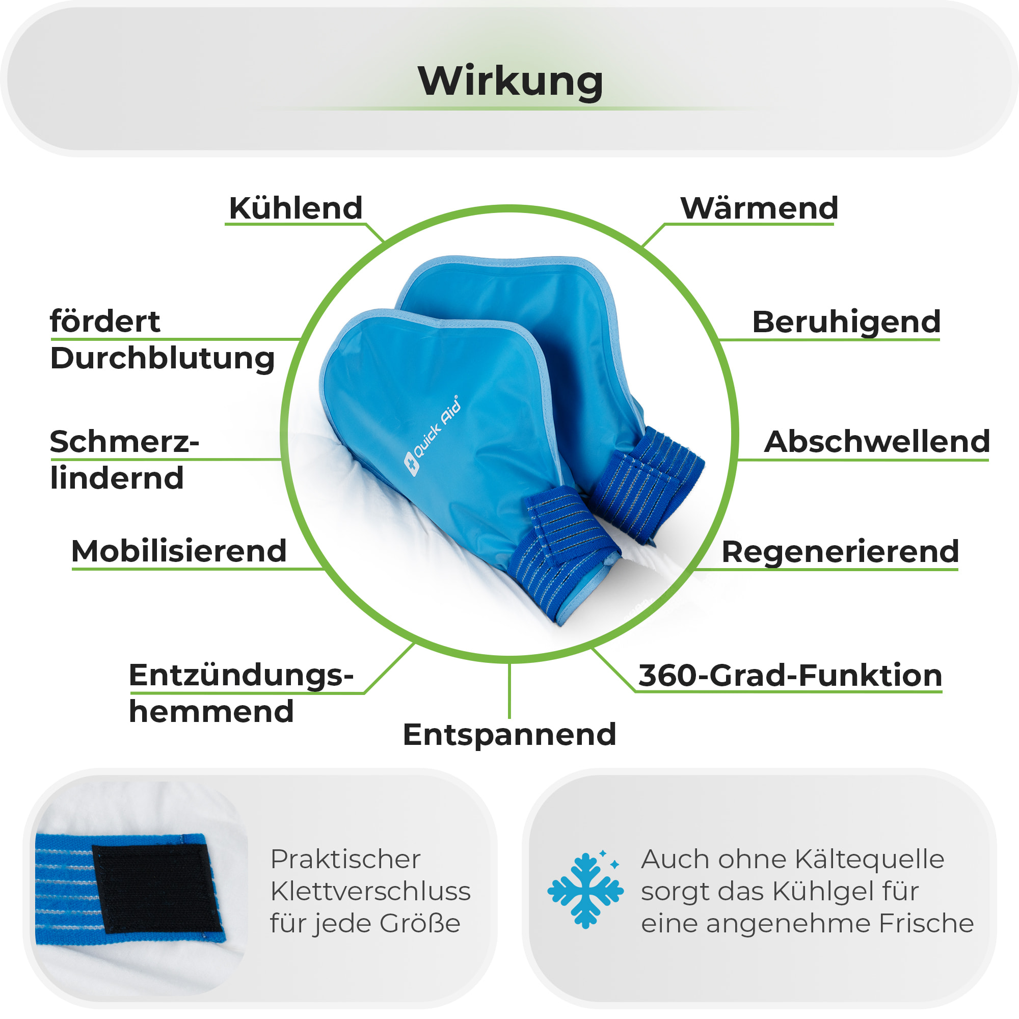 Die Quick Aid® Handschuhe bieten eine rundum gleichmässige Temperaturtherapie – sowohl kühlend als auch wärmend. Sie eignen sich ideal zur Unterstützung des allgemeinen Wohlbefindens in den Händen und können im Alltag, nach Belastung oder für entspannende Regenerationsphasen eingesetzt werden. Das wiederverwendbare Medizinprodukt ist besonders angenehm bei beanspruchten, steifen oder müden Händen.