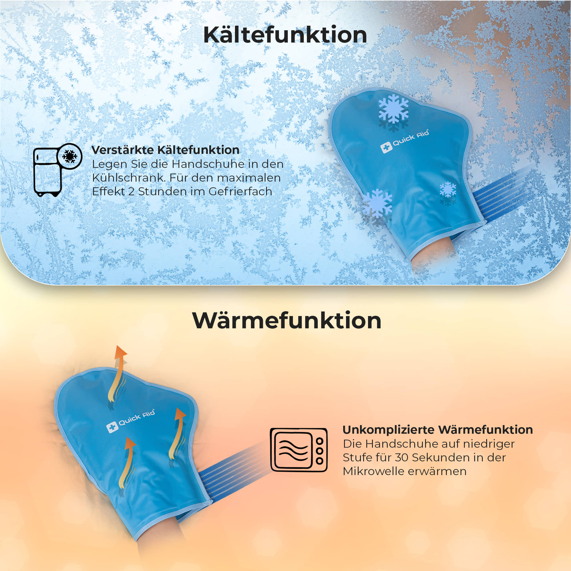 Die Quick Aid® Handschuhe sind mit hochwertigem Gel gefüllt, das bereits ohne externe Kältequelle einen kühlenden Effekt erzeugt. Für intensivere Kälte können die Handschuhe im Kühlschrank oder Gefrierfach heruntergekühlt werden.